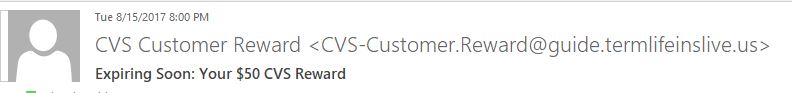 2. If the sender has a name, look at the domain in which it comes from for example: an e-mail is sent and says its from “CVS Customer Reward” yet if you view the true e-mail address of the sender, it is coming from “CVS-Customer.Reward@guide.termlifeinslive.us” Obviously this is a fake e-mail as CVS e-mails would come from  CVS and not Termlifeinslive.us.